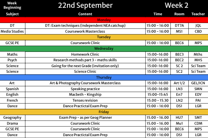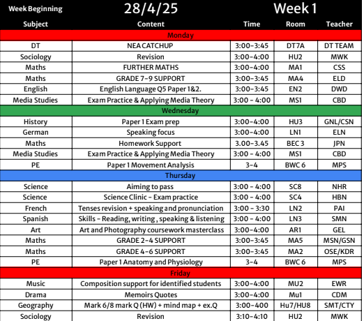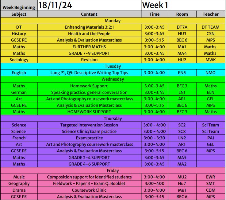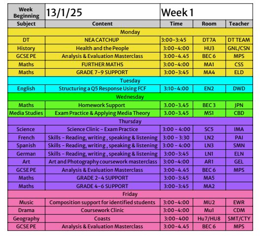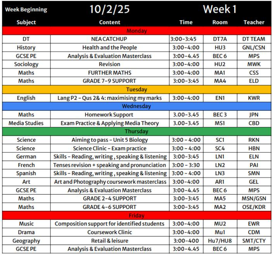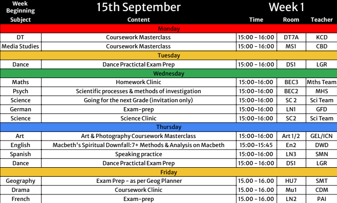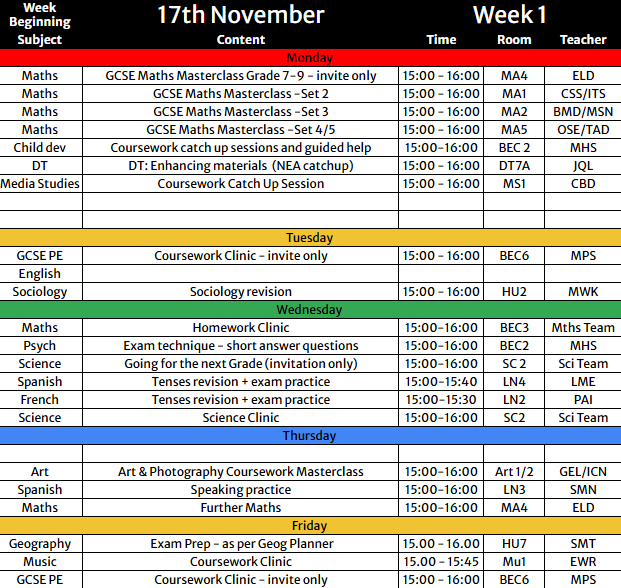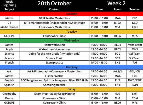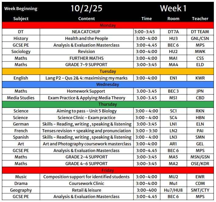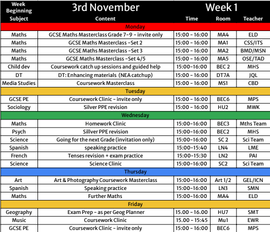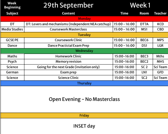 Yr 11 Afterschool Masterclass Timetable Term 1