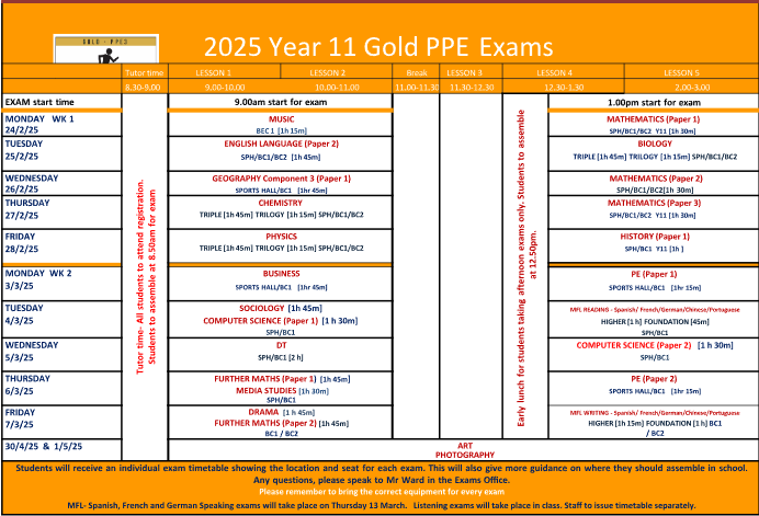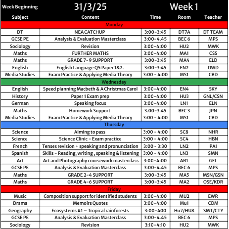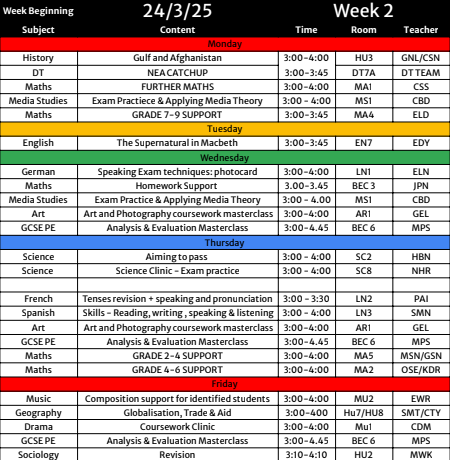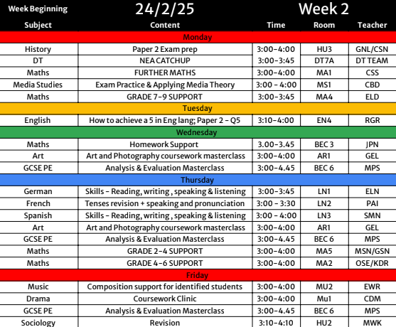 Yr 11 Afterschool Masterclass Timetable 18 3 24